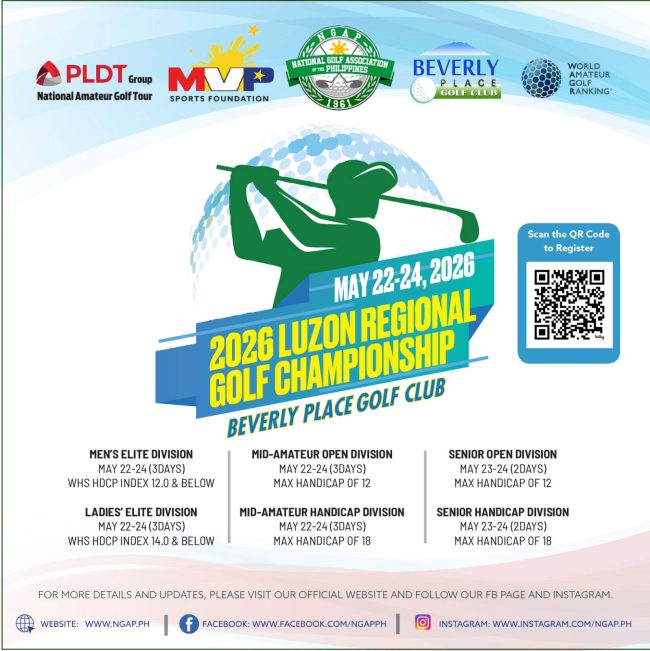 2026 Luzon Regional Golf Championship April 23, 2026April 23, 2026 Date: May 22-24, 2026 (Fri to Sun) Venue: Beverly Place Golf Club TERMS OF COMPETITION REGISTRATION TEE TIMES RESULTS PHOTO GALLERY